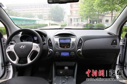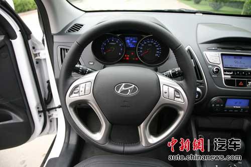 我们拿到的这辆ix35是2.0GLS尊贵版,采用全黑色内饰,除此之外还有上黑下浅的另一种内饰风格。全黑色内饰显然更招年轻人待见。ix35的内饰采用了对称设计,中控面板造型简练,中间的六边形设计和四周的线条再次与车身风格呼应。内饰黑底色上点缀的银色恰到好处,只是几乎整个内饰采用的都是印花硬性材质,车内气味比较明显,多少与这辆车20万出头的价位有些不符。另外,竖条形的空调出风口似乎很容易让人想起伊兰特。