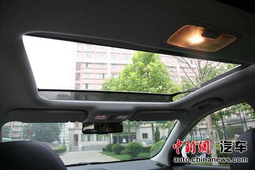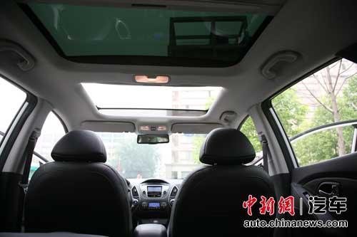 图注:双天窗可能是这ix35上最奢华的配置。若不是有那道支撑车体强度的横梁挡在中间,就是真正的全景天窗了。不过即使这样,前半部54cm×72cm的开启面积已然足够大了。
