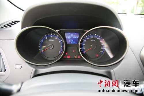 图注:蓝色背光的炮筒型仪表。和老款途胜一样,ix35的行车电脑依旧不具备平均和瞬时油耗显示功能。