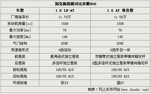 别克新凯越现在缩小了产品线,留下两款搭载1.6L的发动机车型。这款1.6L发动机最大输出功率为78kw,最大输出扭矩为146Nm,比起奔腾B50车型的1.6L发动机在功率上多出了2Kw,扭矩超出1Nm,再加上奔腾B50比新凯越多出的25Kg的车重,动力方面稍显弱势。悬架部分奔腾B50优势明显,前悬架双横臂式独立前悬架带横向稳定杆、后悬架E型多连杆式独立后悬架带横向稳定杆,对车身在过弯的是支撑更显运动感觉,而经过通用细心调教的新凯越则是以前悬架麦弗逊式独立式、多连杆独立后悬架的配合突出舒适感受。
