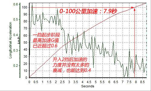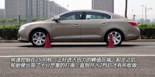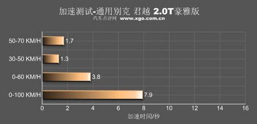 测试场上的2.0T君越并没有让大家失望。先将转速稳定在2500转,然后放开刹车一脚油门到底,车辆稍稍迟钝了零点几秒。起步之后,轮胎出现短暂打滑,车身的姿态也并不是十分的夸张。转速指针爬升的速度绝对不是一般自然吸气发动机可以比拟。从加速测试的工况图上看,3.8秒的时间之后速度已经突破60km/h,最终100km/h的达成时间是7.9秒,这样的成绩足以让那些3.0升甚至3.5升的车型感到汗颜。