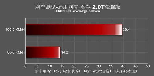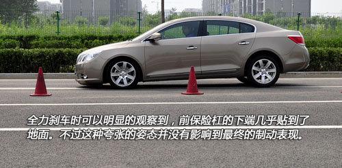 新君越的刹车系统在初段的制动效果有些乏力,踩下踏板初期制动并不明显,究其原因还是在于其1.7吨的车重。不过随着力度的加深,刹车的力度也越来越强大。刹车踏板的反馈也很细腻,感觉每一段行程都能直观的感觉出来。急刹车时ABS早早便会介入,工作起来十分的缜密细腻。245mm的宽胎也能尽职尽责的紧抓住地面,车辆丝毫没有晃动与不稳定的感觉。最终100km/h~0的刹车成绩还不到40米,应该说也是比较理想的。