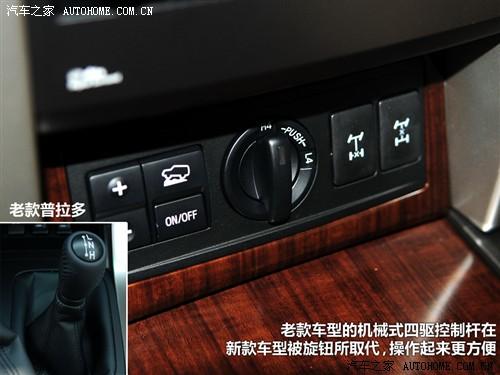 相比老款普拉多,新款取消了机械式的四驱控制杆,而改为一个切换高速四驱和低速四驱的旋钮。同时车内的电子设备也增加了很多。其中最重要的就是MTS多地形可选驾驶辅助,这套系统类似路虎的全地形反馈系统,预设了几种不同的驾驶模式,作于在于减少驾驶员的操作难度、提供更有效地模式。