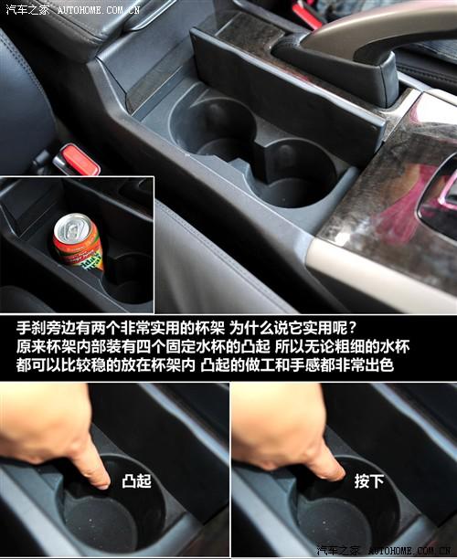 手刹边上的杯架做工非常不错,内部带有弹性的卡扣,各种粗细大小的水杯都可以比较稳的放在其中。而扶手箱下的储物盒虽然深度一般,但是内部的空调出风口大大增加了它的实用性,两个带有空调出风口的储物空间是车内绝对的亮点。