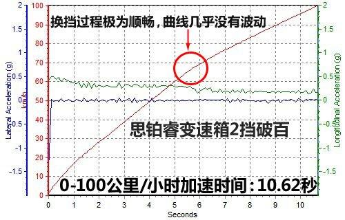 既然说到这里,就让我们先来看看思铂睿的加速成绩。如果你用S挡自动模式(关掉车身稳定控制),起步的时候根本听不到轮胎有一丝接近极限的迹象,看着发动机转速慢慢攀升的样子让人觉得时间十分漫长,最终的成绩都将会在11秒开外,这显然不能代表思铂睿的真实水平。后来测试中我们在S挡下改用手动模式,尽管思铂睿的5挡变速箱可以2挡破百,也就是说在测试过程中只需要换一次挡,但区别还是很大。在S挡模式下,发动机转速会在不到6500转/分钟的时候自动换挡,而手动模式可以把转速拉到7000转,这样一来在换到2挡时就可以获得更高的转速,加速成绩可以提高将近一秒钟左右。最终我们实测的思铂睿0-100加速成绩为:10.62秒。