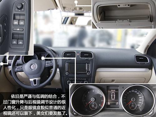 高尔夫6依然延续了大众汽车没有新意的严谨内饰设计,虽然细节感觉上有些动感的感觉,但是……不太显眼。而且下面要说的是眼镜盒问题,现在的年轻女性都喜欢带上那种大大的墨镜,但是当进入到任何一款大众轿车的时候,你的大号墨镜与车内眼镜盒都是完全不兼容的……(所有大众在华车型,包括旗下品牌)