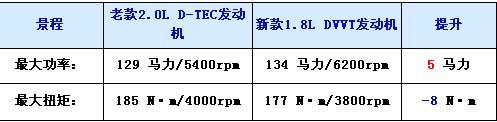 老款景程使用的是一款直列四缸的2.0L发动机,最大功率只有129马力(95kW),最大扭矩为185牛米,对于一款2.0L的发动机来说,这样的数据确实有些不理想。而2010款景程更换了科鲁兹的1.8L DVVT发动机,其采用Ecotec技术,最大功率达到134马力,最大扭矩为177牛米。在排量降低的情况下仍实现了最大功率的反超。