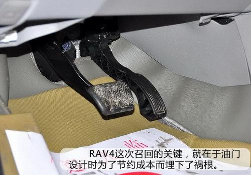 RAV4的油门踏板问题还未完全解决:援引天津一汽丰田的官方说法:“问题车辆由于加速踏板的踏板臂和摩擦杆的滑动面经过长时间使用,在低温的条件下使用暖风(A/C除外)时,会在滑动面发生结露,使摩擦增大,使用加速踏板时有阻滞,可能影响车辆的加减速。极端情况下,加速踏板松开时会发生卡滞,车辆不能及时减速,影响行车安全。”