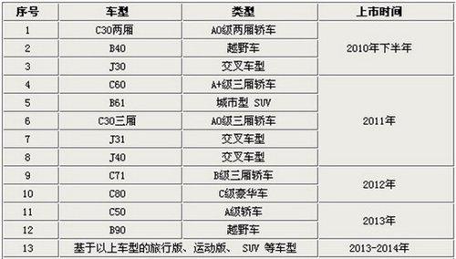 根据规划,在2010-2014年的五年内,将会陆续推出共计20款全新车型,不过目前已经曝光的是12款新车,其中在2010年内有3款新车下线,而2011年将推出5款新车,2012年将推出基于萨博平台的C71、C80两款豪华车,2013年比较引人注目的是酷似揽胜的B90将推出。