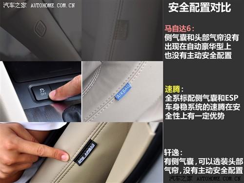 对比配置,我们先从安全性配置开始,在这方面,无疑速腾是最大的赢家,因为马自达6除了最基本的ABS+EBD和双气囊之外,没有别的更多安全配置;而速腾是全系标配ESP和侧气囊的;轩逸尽管主动安全配置没什么亮点,但这款高配车型有侧气囊,而且可以选装头部气帘,所以还是比马自达6更胜一筹。