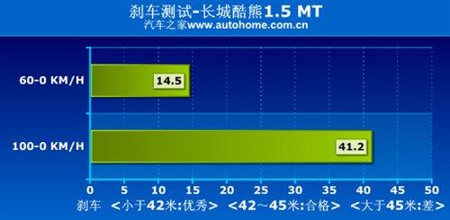酷熊搭载的是排量为1.5升的发动机,可搭载5速手动或者CVT无级变速箱,之前我们测试过手动挡车型,动力表现完全够用,尽管该类车型并非着重于加速性能,但它还是取得了11.5秒的好成绩,41.2米的刹车距离在自主车型中也非常值得肯定,但方方正正的造型在高速状态下带来的风噪比较明显。