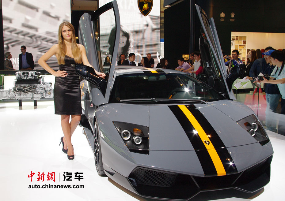 在人流如织的海外汽车巨头的展馆里,天价豪车成了当仁不让的最抢眼明星,相形之下即使再靓丽的车模也黯然失色。图为兰博基尼Murciélago LP 670-4 SuperVeloce