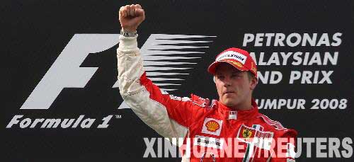 3月23日,法拉利车队车手莱科宁在颁奖仪式上手举奖杯庆祝。当日,在F1大奖赛马来西亚站的比赛中,法拉利车队车手莱科宁以1小时31分18秒555的成绩夺得冠军。法拉利车队车手莱科宁在颁奖仪式上庆祝胜利。