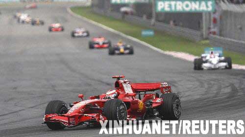 3月23日,法拉利车队车手莱科宁(前)驾驶赛车角逐。当日,在F1大奖赛马来西亚站的比赛中,莱科宁以1小时31分18秒555的成绩夺得冠军。
