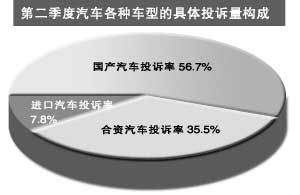 根据统计,第二季度的汽车用户投诉涉及几十个国内汽车生产企业。报告指出,与一季度相比,2007年第二季度中国汽车产品及服务质量的投诉呈现出三方面的特点。首先是合资厂家汽车产品的投诉有上升趋势。合资汽车的问题集中在发动机、变速箱、轮胎、车身附件等方面。其次,新购汽车产品在半年内重要零部件出现问题的投诉增多。二季度对发动机、变速器等核心部件方面的投诉占50%以上。第三,轮胎和车身附件的投诉比例呈上升态势,两者所占份额比一季度上升5.3%。