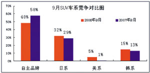 统计数据显示,今年前9月,自主品牌SUV的市场占有率达到了58%,比起去年的48%增长了10%,其中长城和奇瑞瑞虎的销量都在4万辆左右,市场份额达到15%。