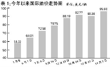 国内油价上涨最直接的因素就是国际油价的大幅攀升。上周国际市场原油价格连创历史新高,达到了94美元/桶。而在此前,纽约WTI原油期货价格2007年年初价格为58.32美元/桶,3月份以后国际市场原油价格开始上涨,特别是近两个月加速上升,9月14日和10月29日分别突破了每桶80美元和90美元。11月2日纽约原油期货价格大幅上扬,比前一个交易日上涨2.44美元,终盘再创新高,收于每桶95.93美元。这个价格比起今年年初上涨了近40美元,涨幅超过80%。此间,国际油价虽然出现过小幅回落,但高位震荡的格局一直难以改观,甚至有愈演愈烈之势。