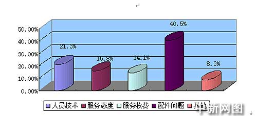 统计表明,服务收费、服务态度和配件供应在关于服务质量的投诉中占到70%以上。同一故障反复修理过程中工时等费用该由谁承担的反映仍十分突出;而配件方面的投诉主要表现在配件供应及时性、配件价格过高及质量不能保证等方面。具体构成比例:人员技术占21.3%,服务态度占15.8%,服务收费占14.1%,配件问题占40.5%,其他占8.3%。
