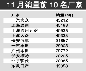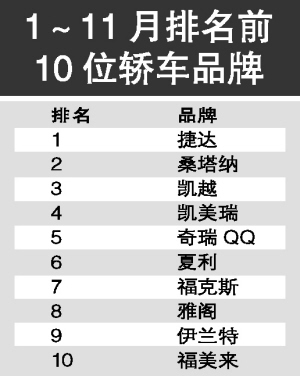 1~11月,自主品牌轿车共销售113.61万辆,占轿车销售总量27%,前10大品牌共销售82.78万辆,占自主品牌轿车销量的73%。自今年10月以来,自主品牌就实现百万辆销售成绩的突破,尽管如此,自主品牌还是不敌日资企业上升趋势强劲。