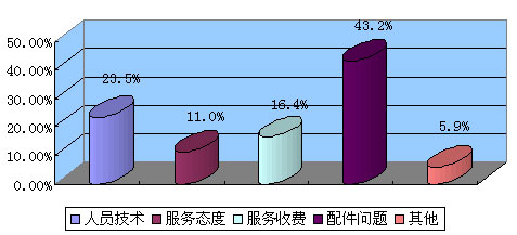 报告显示,在汽车产品服务质量的投诉中,对配件问题、服务态度的投诉较上一季度有所增加,对人员技术、服务收费的投诉有所下降。其中,久修不好是引发消费者投诉厂家服务质量的最主要原因。具体构成比例:人员技术占23.5%,服务态度占11.0%,服务收费占16.4%,配件问题占43.2%,其他占5.9%。