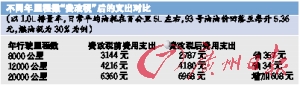 可以看出,按照现行油价计算,对于大部分车主来说,燃油税率越高,所需支付的燃油部分的养车成本比重将更高;对于不同车型来说,排量越高,费改税之后所需要支出的费用也越多;对于相同车型来说,每年行驶里程数越多,费改税之后所需要支出的费用也越多。即使在燃油税开征后,93号油油价回落至今年年初的每升5.36元,对于一辆一年行驶10005公里、油耗在5.0L每百公里左右的1.0L排量小车来说,在费改税之后,还是需要多支付200多元油钱。