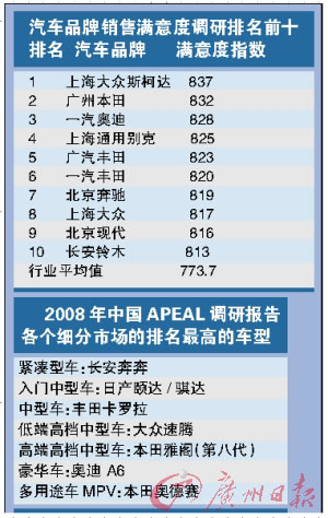 无独有偶,由国务院国资委研究中心、中国汽车工业协会、中国质量协会、中国环保协会等权威机构创立的独立第三方调研活动——“2008中国汽车品牌销售满意度调查”结果出炉,2008年汽车销售行业满意度指数平均分值773.7,较上年提升了5分。但与2007年相比,本土品牌的销售满意度大幅下降5.7%。