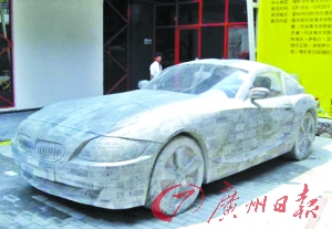 记者昨日获悉,由数万块青砖砌成的宝马汽车在深圳市宝安区西乡街道F518时尚创意园展出(见图)。记者看到,砖雕“宝马”的尺寸外形与宝马汽车无差异,而且车门可以开启,可坐在砖雕车里感受宝马气派。
