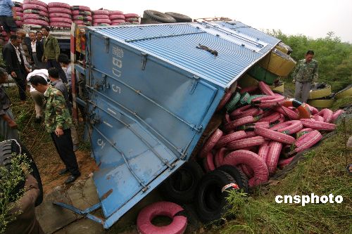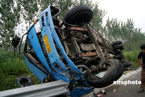 8月31日,一辆车号为鲁BD5113的大货车在进入河南省境内许平南高速公路许昌段时,因严重超载而倒滑、翻车。接报警后,当地交警、武警消防队员立即赶赴现场展开施救,经过1个多小时紧张营救,司机和货主被安全救出并送往医院救治。上午10点14分,在将货物全部倒运后,大货车被吊平,并被拖离现场。中新社发 牛书培 摄