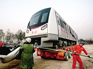 昨天 ,汽车将地铁5号线列车运到太平庄北站,工作人员准备“卸货”。这种运输方式在北京还是首次使用。