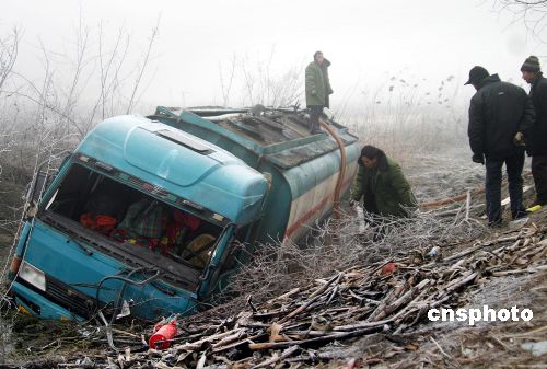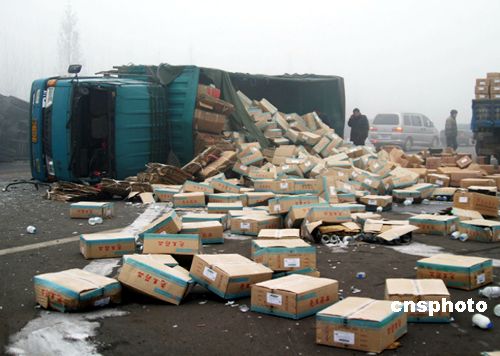 1月4日凌晨,在山东济宁市南外环路段发生连环相撞交通事故,在300多米长的路段内先后发生9起车祸,涉及10多辆车,所幸未造成人员伤亡。中新社发 张晓科 摄