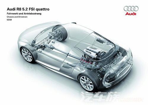 除了具有强悍的动力心脏,R8 5.2 FSI quattro依照惯例的以轻量化铝合金材质打造车体,单就车体部分仅有210kg,使得车重仅有1620kg,经过计算,可拥有3.1kg/hp的重量马力比,可于3.9秒完成起步加速0-100km/h,极速高达316km/h。由于干式油底壳的设计,与优异的底盘结构,使得R8 5.2 FSI quattro可承受最高达1.2g的侧向g力。