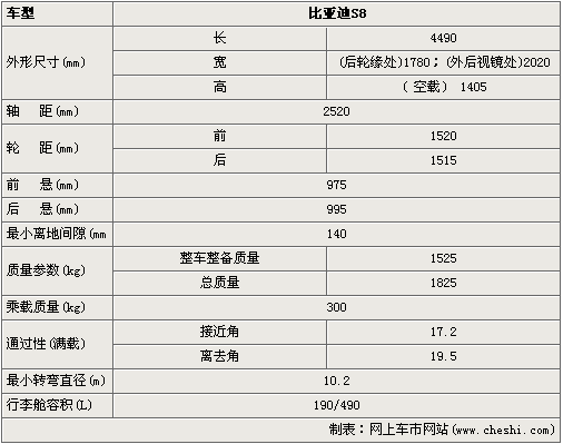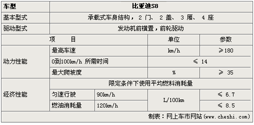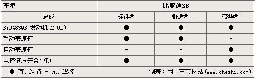 S8预计将有三种款型:标准型、舒适型、豪华型,搭载的是比亚迪自主研发的BIVT 2.0L发动机,最高输出功率110/6000kw/rpm,最大扭矩195/4000Nm/rpm,有手动、自动变速箱可选。