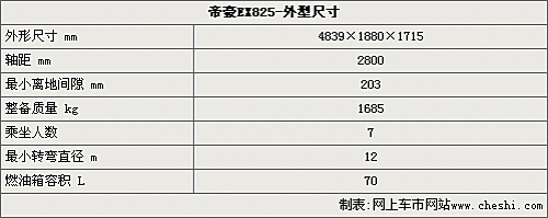 从帝豪EX825的车型尺寸来看,这款大型SUV的车长达到了4839毫米、宽度为1880毫米、高度为1715毫米。而且这款车的轴距也达到了2800毫米,采用7座的设计,从这些数据来看,这款新车不仅是以豪华为主要设计方向,也注重了整车的实用性。