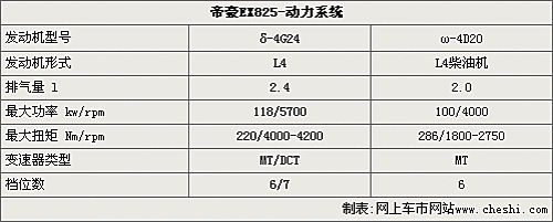 在动力方面,帝豪EX825将搭载两款发动机,其中一款为2.4L排量的汽油发动机,最大功率可达118千瓦,而且在4000转的时候即可迸发出220牛.米的扭矩。这款车型可以匹配六速手动变速箱,还可以配备吉利研发的7速双离合变速器。另外,这款车还搭载了2.0L柴油发动机,在4000转的时候就可以达到100千瓦的最大功率,1800转的时候的扭矩就可以达到286牛.米,低转速的动力表现着实不错。