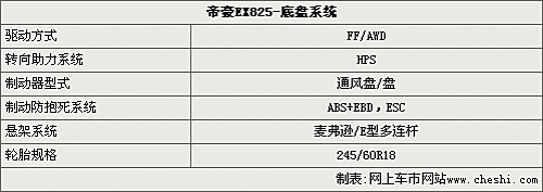 作为一款大型SUV,帝豪EX825的越野性能的高低也非常关键。从底盘系统来看,这款新车采用前置前驱和全时四驱两种驱动方式,虽然与4WD有细微的差别,但AWD驱动也足以让很多关注吉利的消费者动心了。这款SUV产品配备了液压助力转向系统,前通风盘、后盘式制动,提高了整车安全性和可靠性。