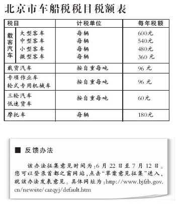 昨天,北京市法制办通过首都之窗网站发布《北京市实施<中华人民共和国车船税暂行条例>办法》(送审稿),向社会公开征求意见。在该送审稿中,北京市载客汽车的车船使用税税额调整为360元至600元,比原来的标准200元至300元高出不少。
