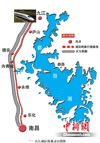 中国第二条城际铁路,江西省第一条城际铁路——昌九城际铁路于2007年6月28日正式开工,起点位于九江庐山站,终点为南昌北站。作为省部重点合作项目的昌九城际铁路全长131.27公里,设计时速200公里,预留时速250公里。