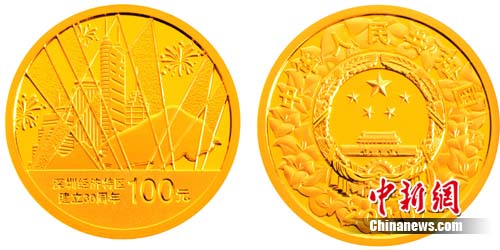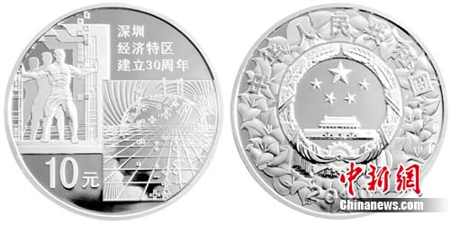 中国人民银行今天向海内外公开发行深圳经济特区建立30周年金银纪念币一套。该套纪念币共2枚,其中1/4盎司金币1枚,1盎司银币1枚,均为中华人民共和国法定货币。