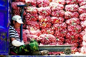 7月20日,北京新发地市场,大蒜商户在等候买家。 卓恩森 摄