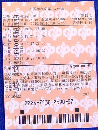 2010年8月10日晚,中国福利彩票双色球第2010092期开奖,当期全国共中出一等奖55注,单注奖金5059590元,其中上海一彩民凭借自选蓝色球复式5注,倍投10倍,共投注200元的一张彩票,中得了50注一等奖和50注二等奖,共中得奖金2.59亿元。