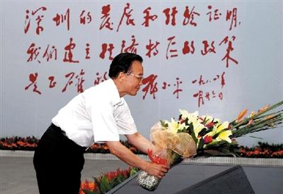 昨天,温家宝专程来到深圳博物馆参观《改革开放总设计师邓小平》大型展览。在展览大厅里,温家宝向邓小平铜像献上鲜花并三鞠躬。温家宝说,没有小平同志,没有改革开放,就没有深圳的今天,就没有中国翻天覆地的变化。小平同志的思想和功绩将永载史册。新华社发