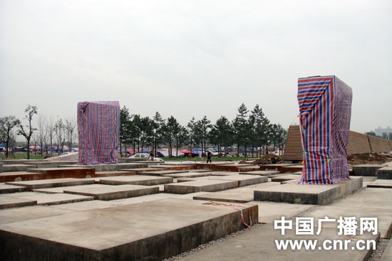 公园南面的崇明门,广场中央立着两个被塑料纸包起来的雕塑,透过塑料纸的缝隙可以看到,里面是铁锈色的钢板,钢板中间是一面红色的城门,纪大爷说,这种铁锈色的钢板是从德国进口的,这样的雕塑本来有5个,现在拆得只剩下两个。