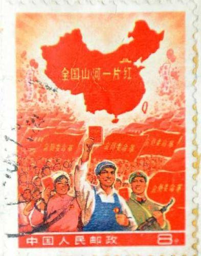 “全国山河一片红”于1968年11月25日发行,图案为工农兵手持《毛主席语录》,背景是“革命委员会”的红旗汇成的红色海洋和工农兵群众热烈欢呼的场面,上方为一幅中华人民共和国地图,地图上除台湾省外全部绘成大红色,上面印有“全国山河一片红”金字。