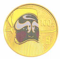1/4盎司彩色圆形金质纪念币背面图案为表现廉洁清正、疾恶如仇的“包拯”京剧脸谱造型(局部彩色),并刊“包拯”中文字样及面额。1/4盎司彩色圆形金质纪念币为精制币,含纯金1/4盎司,直径22毫米,面额100元,成色99.9%,最大发行量30000枚。