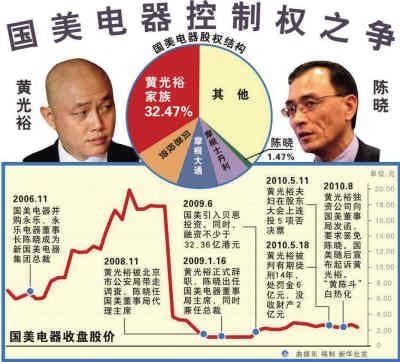 综观整个事件,失去人身自由的黄光裕隔空应战自如,只拥有1.47%国美股权的陈晓“以小博大”,对抗拥有32.47%股权的控制权,看似不可为,实则都在国美特有公司规则下合法腾挪