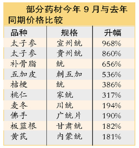有统计显示,从2009年9月至2010年9月的时间段中,中药材约8成品种的价格上涨,其涨幅之大,波动频率之快,均是历史罕见。市民惊呼,中药材普涨,恐怕连病都看不起了。