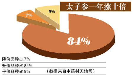 老百姓大药房中药材采购的负责人刘泽良告诉记者,“几乎所有的中药材都在涨价。本来夏天都是药材销售的淡季,今年却很特别,药材一个赛一个地往上涨。其中太子参当属领头羊,而且每周都在上涨。还有红参、桂圆肉、百合、黄芪等都在涨价,与年初相比,中药材普遍的涨幅都在3成以上。”