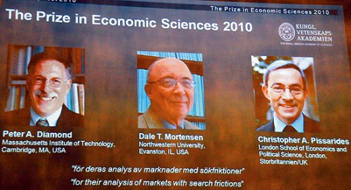 三位此前并不受人关注的经济学家获得了2010年诺贝尔经济学奖,他们是麻省理工大学的彼得·戴蒙德、伦敦政治经济学院的克里斯托弗·皮萨里季斯和美国西北大学的戴尔·莫滕森。
