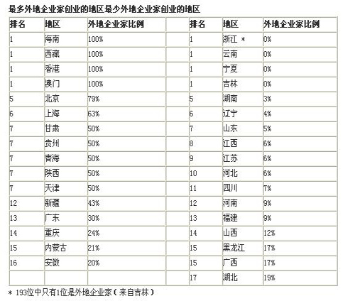 榜单显示,海南、西藏、香港和澳门是最多外地企业家创业的地区,将公司总部设在这四个地区的企业家,全部都是其他地区出生的。相反地,浙江、云南、宁夏和吉林这四个地区则是最少外地企业家创业的地区。在北京和上海创业的外地企业家比例分别为79%和63%。