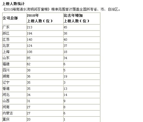 中新网10月12日电 胡润研究院今日在北京发布《2010海南清水湾胡润百富榜》。其中,65岁的宗庆后以财富800亿元成为2010年中国首富。另外,地区榜单中,浙江194人登上胡润百富榜,但无一人无外地企业家。